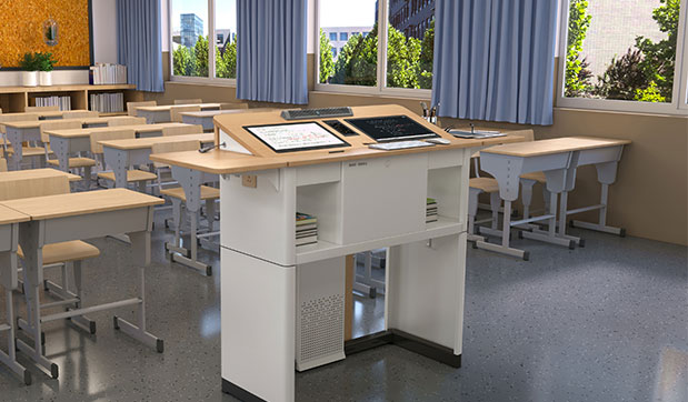 依能领讲·智教舱是集屏幕电子板书、资料高拍、无线麦克音响系统、课堂实录、智能中控等为一体的“全纳型”多媒体教学设备,可接入通用教学电脑、大屏显示设备、音响设备、摄像头、物联网等第三方硬件,适合全场景教室使用。