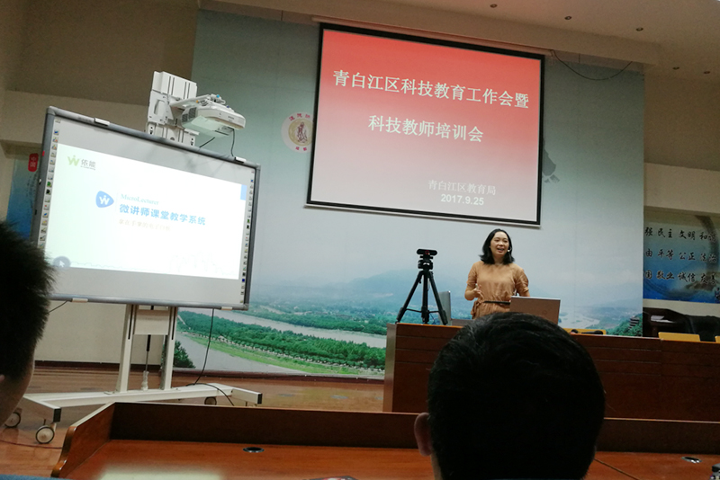 本次活动围绕普及科普知识及科技能力提升,着重对青白江区科技示范学校科技作品、科普知识、科技产品等进行分区展示交流,并对其科技教师进行培训。在科技产品体验区,我司科技创新产品微讲师课堂教学系统,备受与会领导、参会老师及观展学生的青睐。纷纷表示该产品有助于学校的多媒体教学,通过其集成的无线设备,可进行互动式教学,彻底摆脱讲台的束缚;运用高清摄像头进行科技实验实训过程的高清展示,真正做到小班实验大班做。