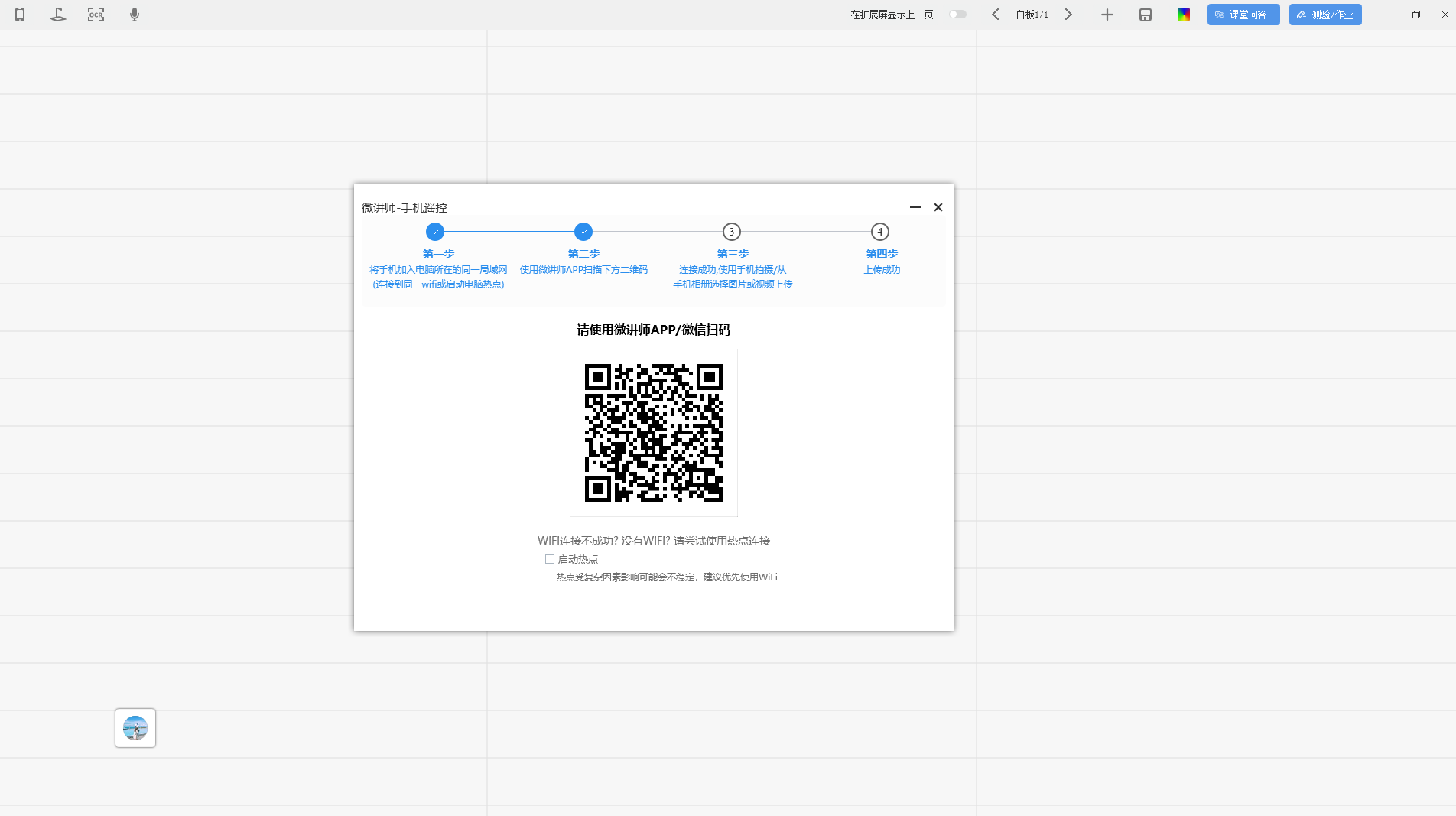 1. 在手机和电脑都接入互联网的条件下,打开白板工具,点击左上角“手机拍摄”按钮,弹出二维码连接界面,使用微信扫码,授权即可登录;