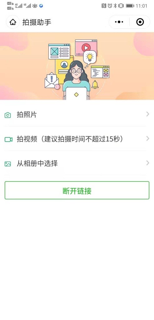 2. 手机扫码连接成功后,进入小程序界面,便可使用拍照片、拍视频功能,拍摄学生作业资料、练习过程无线上传。还可拍摄多个学生的作业或视频进行对比讲解,提高教学效率。