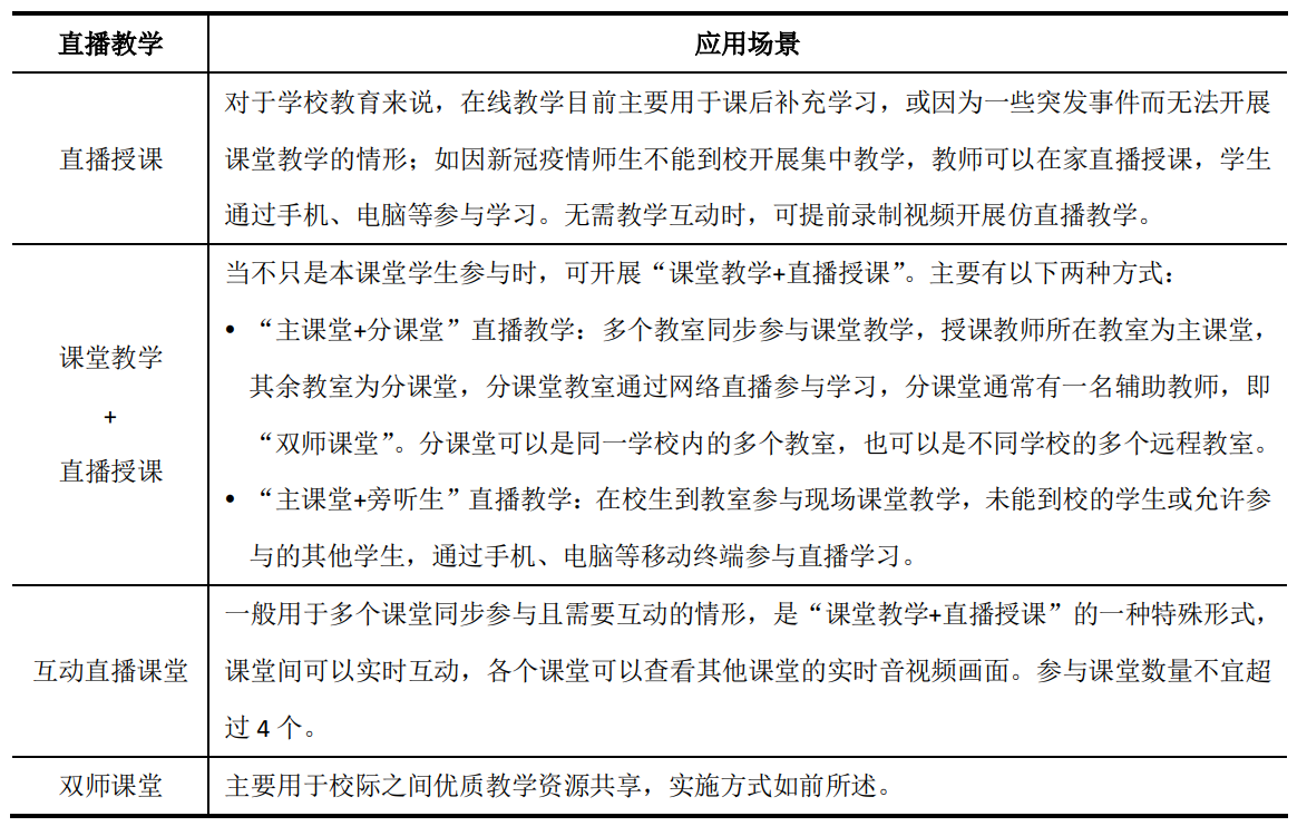 直播教学是信息技术支撑下的一种新型教学模式,是对课堂教学的补充。不同应用场景有不同应用模式,对软硬件支撑系统也有一定要求,如下表所示。