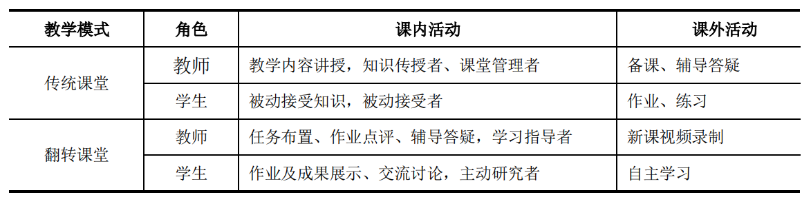 与传统课堂相比,师生在课堂内外的任务分工发生了明显转变,如下表所示。