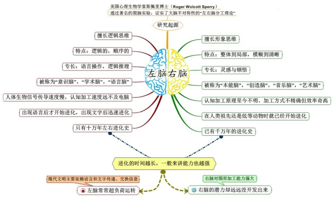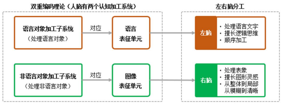 “双重编码”理论的一个重要原则是:人类总是试图以左右脑同时对同一事物进行认知加工。 因此,同时以视觉和语言形式呈现信息,能够促进全脑思维,降低左脑的认知负荷,增强记忆和识别效率。“双重编码”理论是知识可视化的理论基础,图示教学法是双重编码理论的典型应用。