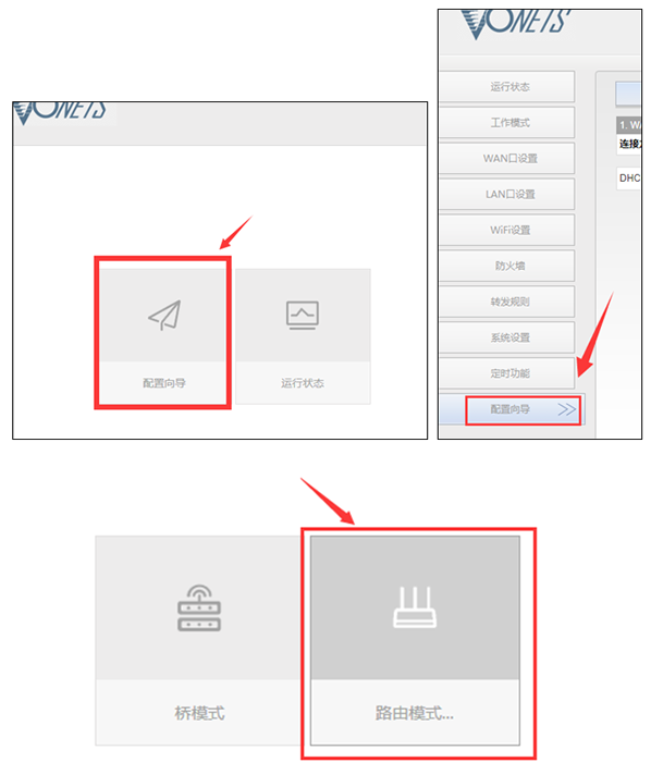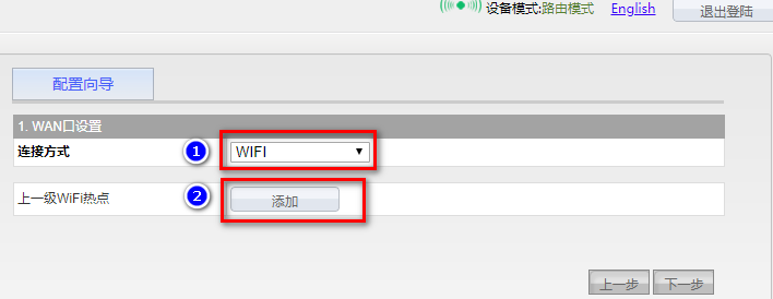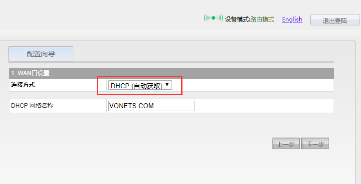 3. 点击页面上的“配置向导”菜单,选择“路由模式”(如果已经是路由模式,则会自动进入到“WAN口设置”页面)