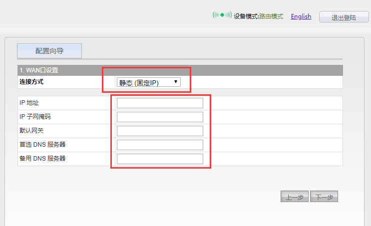 连接方式二:WAN口有线连接网络——静态(固定IP)