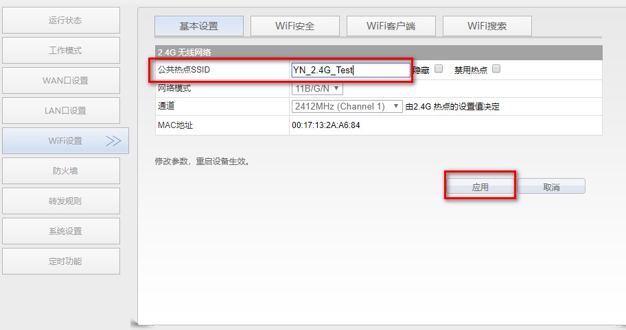 1. 更改WiFi名称:在“WiFi设置”里选中[基本设置]选项卡,在SSID后的文本框中输入新的 WiFi名称,点击“应用”按钮;