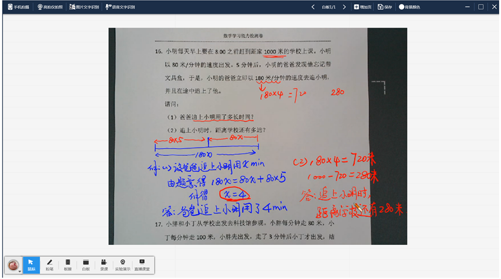 在日常的课堂讲授过程中老师需要对学生的优秀范例、常见错误、随堂习题、试题等进行示范讲解时,可通过白板工具的手机高拍功能扫码拍照/录制视频,实现随拍随传。上传成功后电脑端、投影屏幕同步显示拍摄内容,学生无需离开座位即可清晰直观获取知识。日常作业、试卷也可以同样快捷展示。同时通过无线板书功能,老师可以对试题、练习、错题等进行讲解、批注,不仅便于点评及讨论还能轻松实现走动式教学,省时省力,提升课堂效率。