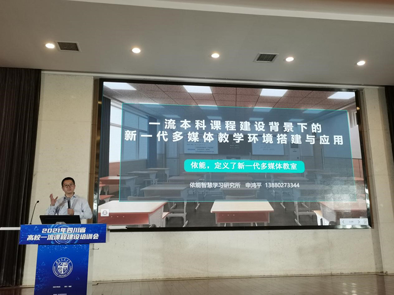 依能智慧学习研究所研究员、成都依能科技股份有限公司副总经理申鸿平在会上作了题为《一流本科课程建设背景下的新一代多媒体教学环境搭建与应用》的技术报告。从教学环境搭建与应用的角度诠释了新一代多媒体教室如何支撑一流本科课程建设,详细阐述了教学环境管控、精细化板书、双大屏教学、课堂教学互动等应用的价值和实现方式。最后,他还展示了国内部分院校的案例,充分呈现了新一代多媒体教室建设的应用成果。