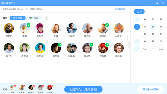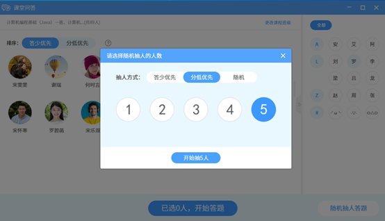 课堂上为了能够尽量照顾到每位学生,老师可以按照答少优先或分低优先的原则随机抽人作答,让那些课堂问答参与较少、答题积分较低的学生能优先被抽中,体现教育的公平性。