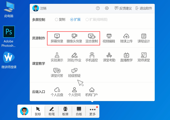 打开微讲师授课,选择录制方式,一键点击,即可开始同步记录精彩课堂教学活动。