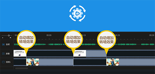 使用微讲师自动智能编辑功能,自动删除冗余片段,软件自动选择在特定时刻显示电脑屏幕内容还是某个摄像头画面内容,如操作电脑时展示电脑屏幕内容,师生互动时展示摄像头拍摄的互动画面内容,并且在不同视频画面切换时还会自动增加转场效果,实现平滑过渡。