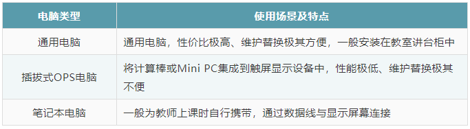 电脑是最基础的多媒体教室设备之一,多媒体教室使用的电脑主要类型包括通用电脑、插拔式OPS电脑、笔记本电脑,各自的使用场景及特点如下表所示。