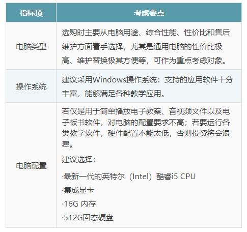 选购多媒体教室的教师用电脑时,可参考“教学电脑选购指标及要点”,如下表所示。