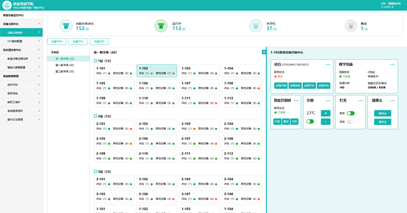 基于新建多媒体教室物联网管控平台,实现对全校所有讲台设备的运行状态监控,能够按校区、楼栋、单个教室等多种维度对智能讲台进行远程控制、设备巡检。物联网管控平台与学校教务系统课表、统一身份认证系统对接后,可以灵活配置多媒体教室设备的管控策略如根据课表提前进行设备自动开启和设备状态自检等。有利于将学校的教学管理和服务进行融合,这样投入资金将会减少、服务方式更加便捷、管理效能大幅度提升。