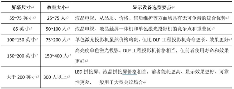 对于100人以下的教室优先选择普通液晶电视作为显示设备,但超过85英寸的液晶电视价格昂贵,安装、维护、运输等极其不便。因此,需要更大显示屏幕的教室可选择单色激光投影。