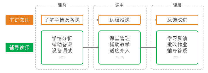 双师课堂教学应用模式是指一位远程的主讲教师(顶级牛师/明星教师)+ 一位本地的辅导教师,课前由本地辅导教师协助远程主讲教师进行备课和学情分析,上课时主要由远程主讲老师进行授课,本地老师做课堂纪律管理等,课后主要由本地的辅导老师在课堂上进行一对一答疑、针对性的辅导、查漏补缺、巩固练习、批改作业等课堂服务。
