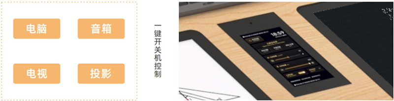· 轻轻一按,讲台、电脑、大屏同步开启。