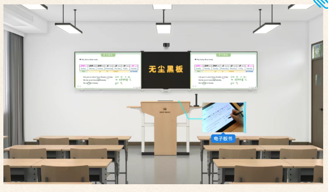 电⼦板书完美替代粉笔板书,⽆尘⿊板作为停电书写、下课后不开机在⿊板上留⾔的备份机制,两者配合可彻底告别粉笔板书,打造全新⽆耗材的⽆尘教室;教室⼲净⽆粉尘,师⽣不再吃粉笔灰;⼤幅减少教室清洁⼯作量,延长空调、电教设备使用寿命,为学校安装新⻛系统创造条件,教室环境档次焕然⼀新。