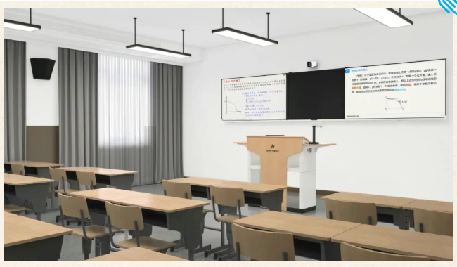双大屏中间留出了⼀块使⽤频率低、可被教师⾝体遮挡的区域,双大屏幕+无尘黑板方案,为讲台居中布置创造了条件,让⽼师回归C位,教室⻛⽔重回正道。